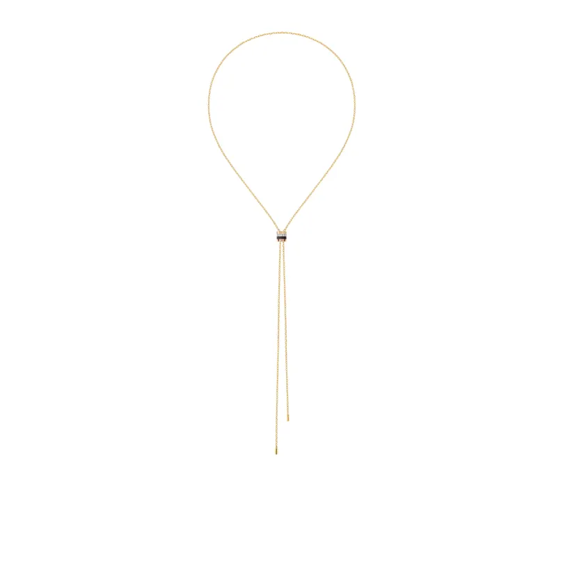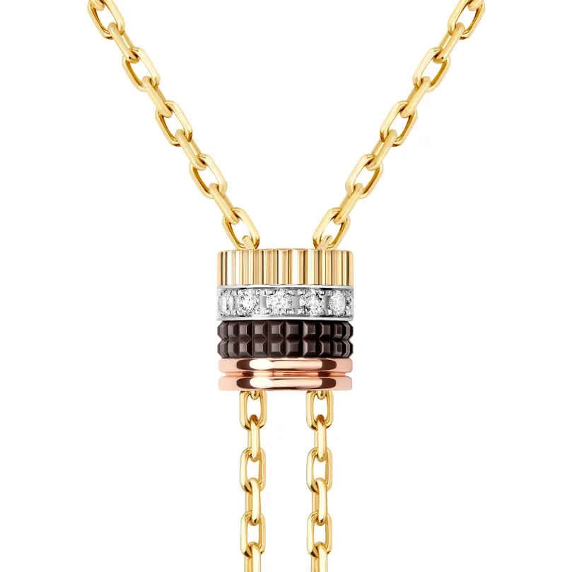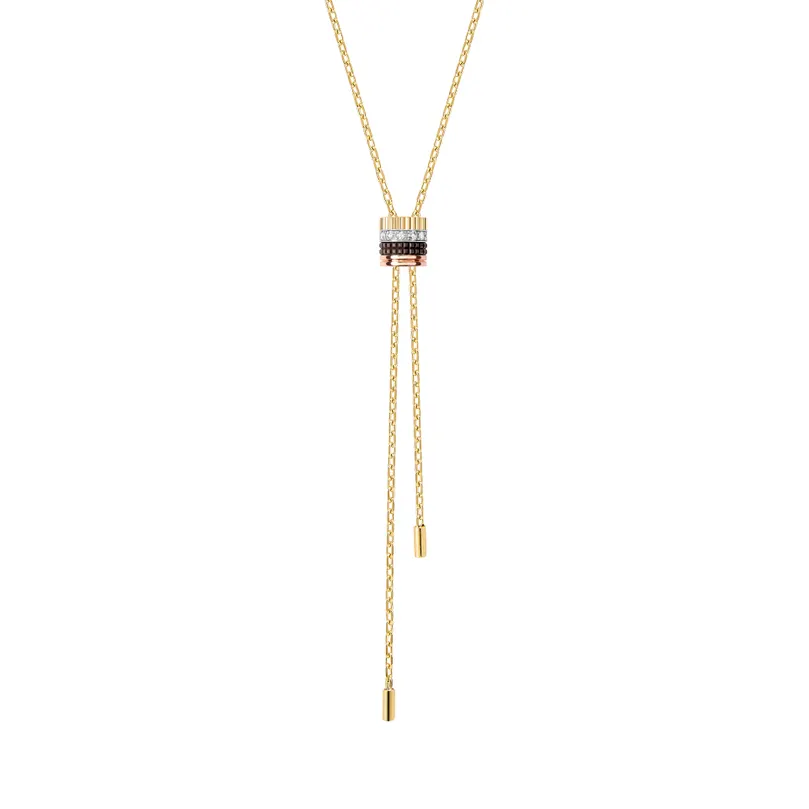 The strength of the piece begins with Boucheron’s celebrated Quatre design language. Since 2004, the collection has built its reputation on four distinctive visual codes: Grosgrain, Double Godron, Clou de Paris, and Ligne de Diamants. In the tie necklace, those motifs come together in a way that feels cohesive rather than crowded. The blend of yellow gold, white gold, rose gold, and brown PVD gives the piece texture and rhythm, allowing tradition and modernity to interact beautifully.