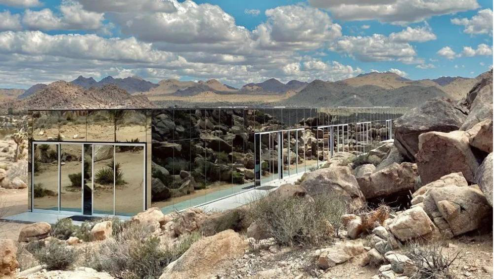Designed by film producer Chris Hanley in collaboration with architect Tomas Osinski, the house draws inspiration from the monolithic shapes of 2001: A Space Odyssey. Its ultra-minimalist design features a reflective glass exterior that camouflages into the desert landscape, appearing almost ethereal at different times of the day.