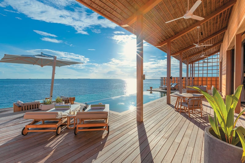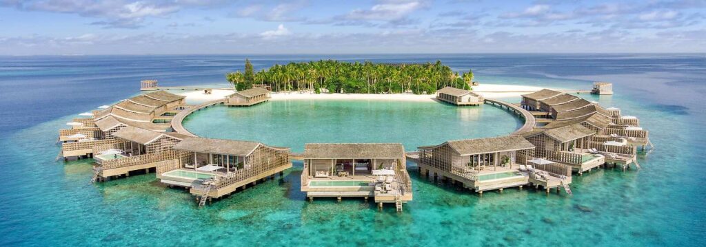 Hosting only 15 overwater villas, each spanning over 300 square meters, Kudadoo is the epitome of intimacy. Every villa features an infinity pool merging into turquoise seas, round-the-clock butler service, and interiors crafted from natural woods and artisanal details. Guests dine wherever inspiration strikes — on the ocean deck, under the stars, or beneath the waves at Hurawalhi’s famed 5.8 Undersea Restaurant nearby.